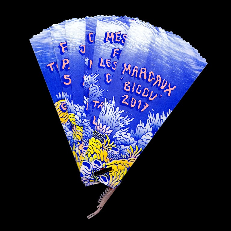 Éventail imprimé en risographie orné d'un appât crevette phosphorescent.